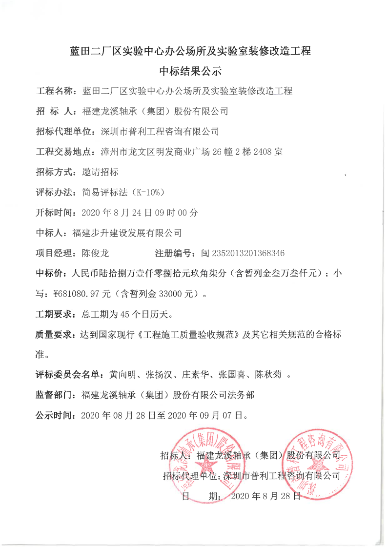 一号娱乐集团蓝田二厂区实验中心办公场所及实验室装修改造工程中标结果公示