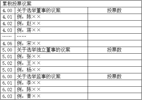 某投资者在股权登记日收盘时持有该公司100股,采用累积投票制,他(她)在议案4.00“关于选举董事的议案”就有500票的表决权,在议案5.00“关于选举独立董事的议案”有200票的表决权,在议案6.00“关于选举监事的议案”有200票的表决权。
