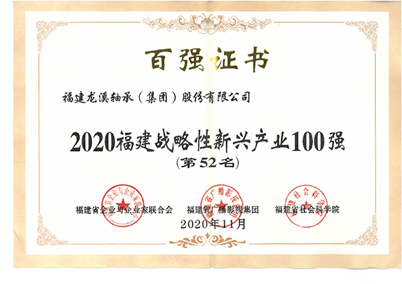 2020年11月20日,2020福建企业100强发布大会暨福建企业家大讲坛在宁德市举办。会上,福建省企业与企业家联合会联合、福建省社会科学院、福建省广播影视集团联合发布的“2020福建战略性新兴产业领军企业100强”榜单中,福建龙溪轴承(集团)股份有限公司位列榜单第52名。