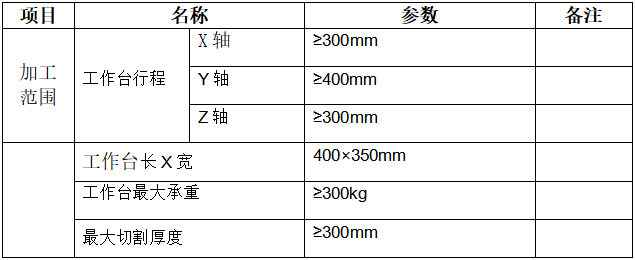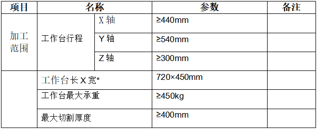 (1)设备功能要求(关注工作台长X宽为720×450mm以上,最大切割厚度大于400 mm)