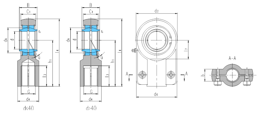 产品特点:带锁口杆端关节轴承由杆端体和向心关节轴承GEEW…ES组装而成,用挡圈固定,d<63,杆端体材料是碳钢,63≤d≤80,杆端体材料是碳钢或球墨铸铁,d>80,杆端体材料是球墨铸铁,杆端体的内螺纹带有锁口,配有螺钉紧固;可通过油杯润滑。