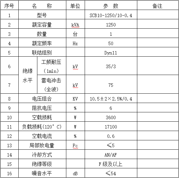 项目名称:购置1台1250kVA干式变压器(含变压器罩等)