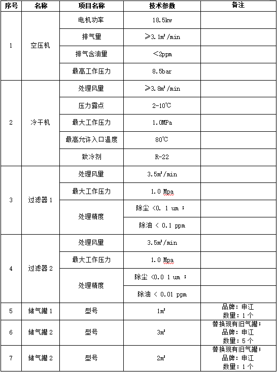 项目名称:购置1套空压机系统(约18.5kw,含配套冷干机、1m³气罐、过滤器)