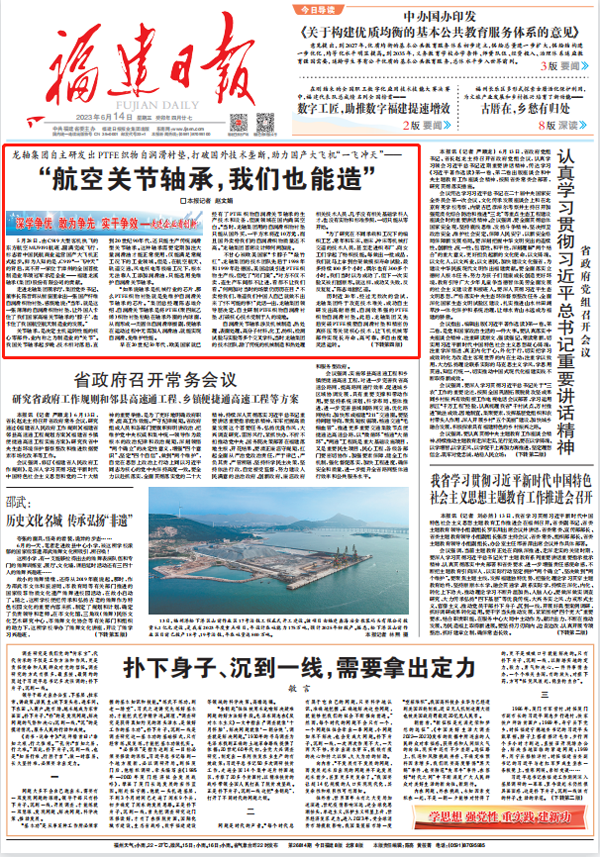 6月14日,《一号娱乐集团自主研发出PTFE织物自润滑衬垫,打破国外技术垄断,助力国产大飞机“一飞冲天”——“航空关节轴承,我们也能造”》荣登《福建日报》头版头条。