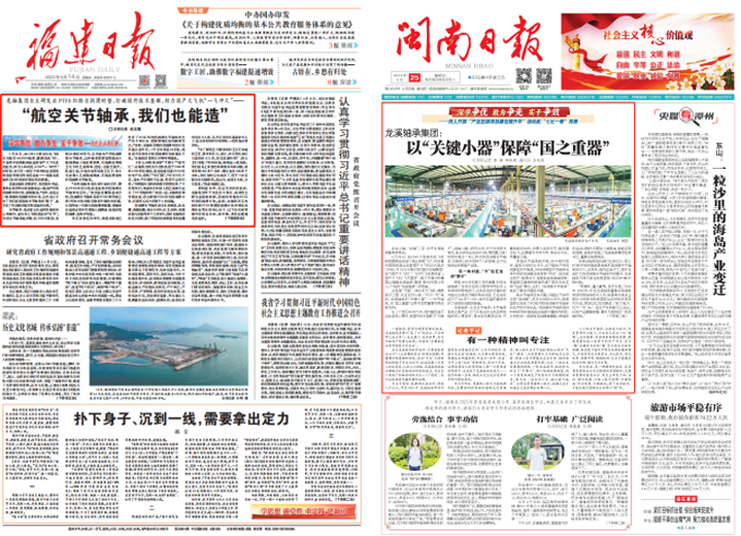 公司以国家安全为己任,自主研发全球领先的“三大核心技术”,突破国外技术和产品封锁,助力实现我国“大飞机梦”。2023年6月14日《一号娱乐集团自主研发出PTFE织物自润滑衬垫,打破国外技术垄断,助力国产大飞机“一飞冲天”——“航空关节轴承,我们也能造”》荣登《福建日报》头版头条,并获新华网推介;6月25日《闽南日报》头版头条专题报道《龙溪轴承集团:以“关键小器”保障“国之重器”》;获评漳州市“突出工业、突破工业”十件大事。